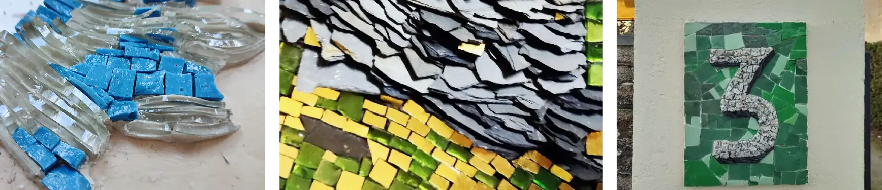 Aujourd’hui, je crée des œuvres mosaïquées mêlant esthétique, sens et engagement. Mon travail s’ancre dans une démarche de réemploi, de création partagée et de poésie du quotidien.