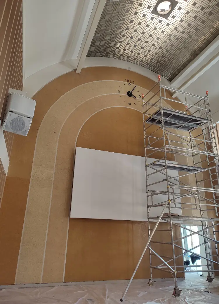 Chantier de conservation / restauration du pignon de l’ancienne salle des Alambics, Place Molière à Angers (siège du Crédit Mutuel, ancienne usine Cointreau).