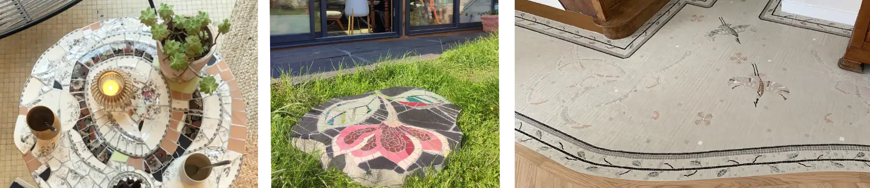 Pour les particuliers comme les professionnels, la mosaïque se glisse partout, en touche délicate ou en pièce maîtresse, pour sublimer vos espaces — qu’il s’agisse d’une enseigne, d’une crédence, d’un pas de porte, d’un bassin ou d’un muret, fresque ou façade pour une boutique, un restaurant, un hôtel, ou tout simplement votre maison… Elle apporte caractère, poésie et reflète vos envies.